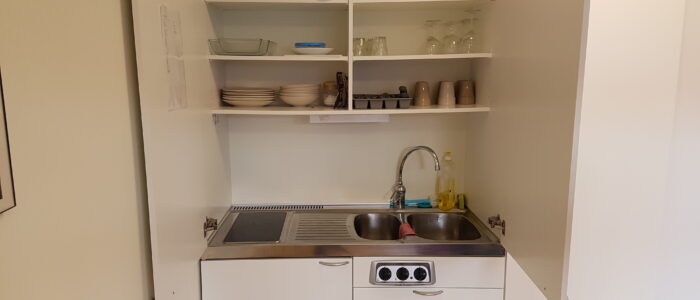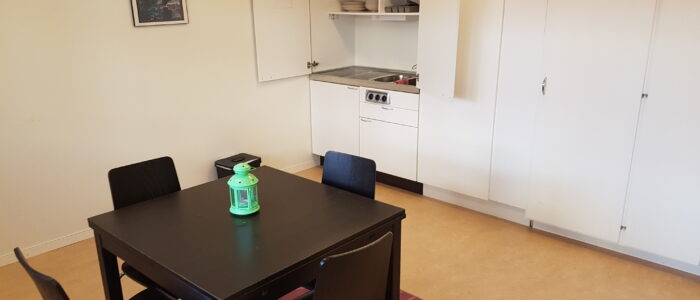 Lägenheten är utrustad med bord och stolar, kyl & frysfack, kaffebryggare & två spisplattor. Det finns även tallrikar, glas, muggar & bestick. Tillgång till internet finns inte i gästlägenheten. Toalett & duschkabin finns.