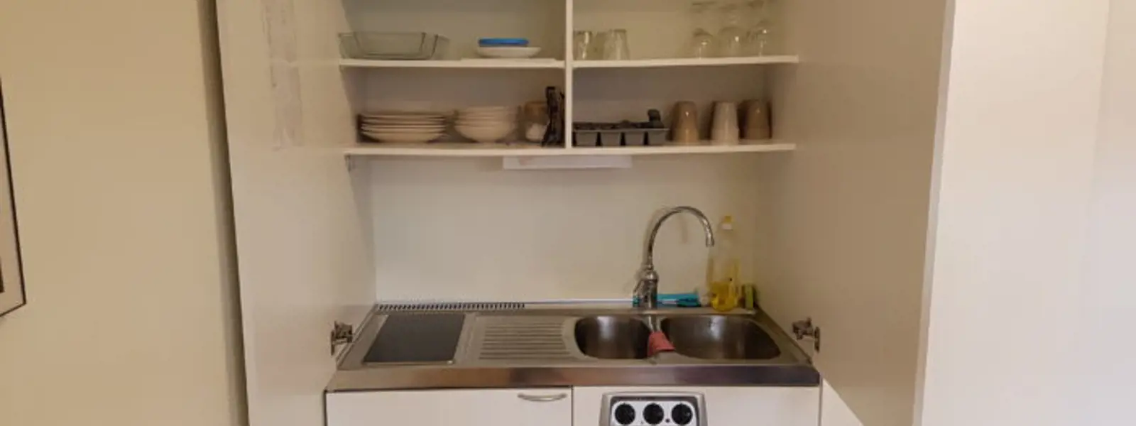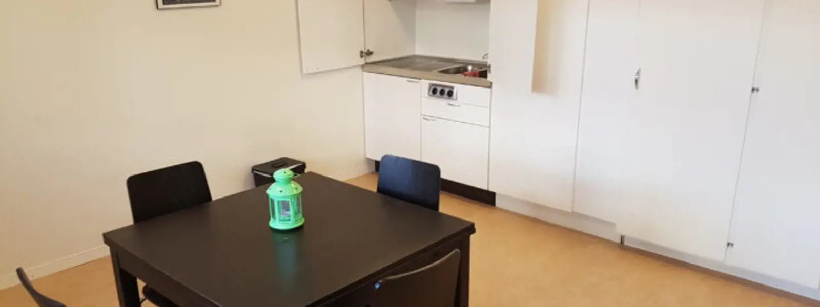Lägenheten är utrustad med bord och stolar, kyl & frysfack, kaffebryggare & två spisplattor. Det finns även tallrikar, glas, muggar & bestick. Tillgång till internet finns inte i gästlägenheten. Toalett & duschkabin finns.